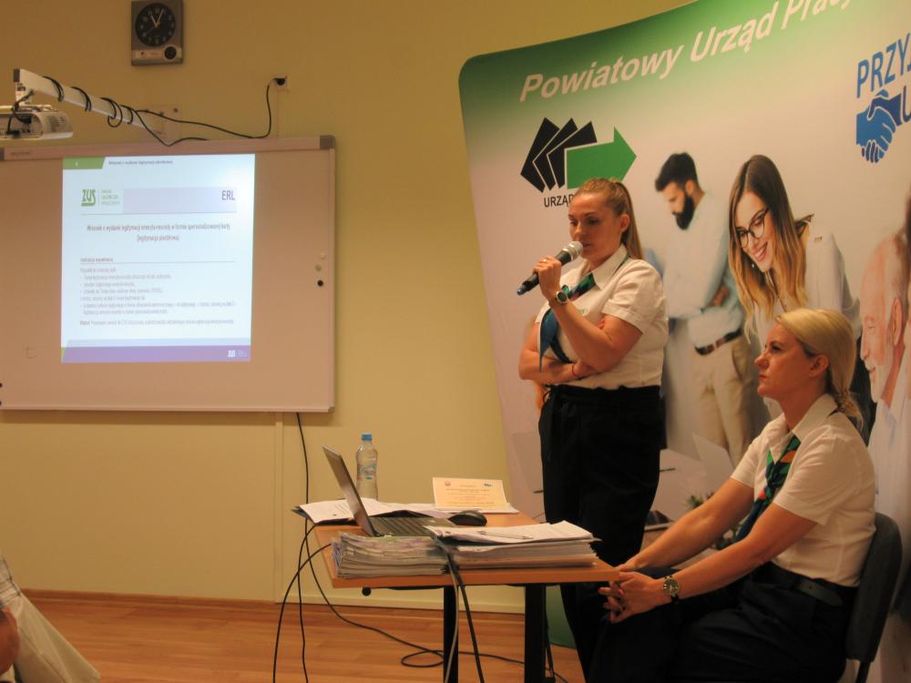 Swoją prezentację przygotowali również pracownicy ZUS w Mławie. Pani Jolanta Jankowska i Pani Anna Wańszys omówiły tematy związane z mLegitymacją, umową uaktywniającą, działalnością nierejestrowaną oraz przedstawiły zagadnienia związane z wyliczeniem wysokości świadczenia emerytalnego i jak również z ogólnymi zasadami przejścia na emeryturę.
